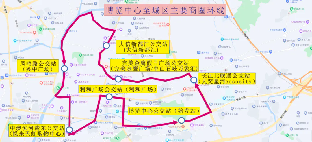 2、 博覽中心至城區主要商圈環線 途經站點:博覽中心站、天奕星河COCO City(長江北聯通公交站)、完美金鷹廣場/中山石岐萬象匯(完美金鷹假日廣場公交站)、大信新都匯站、興中廣場(鳳鳴路公交站)、悅來天虹購物中心(中澳濱河灣東公交站)、利和廣場站、博覽中心站 服務時間:博覽中心站(環線始發站發車時間)9:00-20:30 班次間隔:30分鐘/班