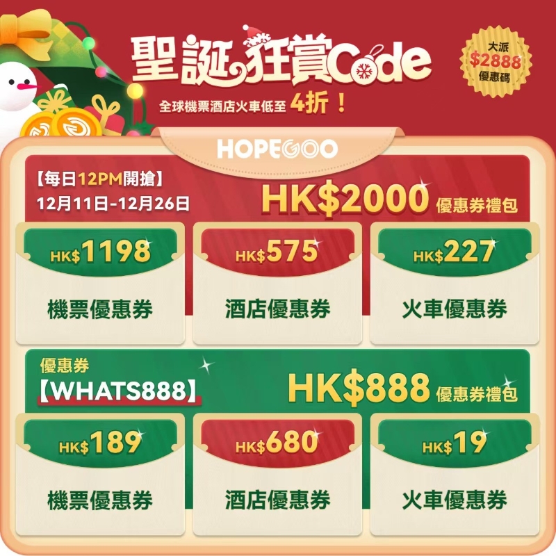 香港新聞網12月17日電 香港同程旅行 (00780.HK) 旗下的新一代旅行平台HopeGoo,持續為香港用戶帶來旅行福利,讓您一App即可享受一站式的旅行預訂服務。由12月9日起至12月31日,HopeGoo 隆重推出“聖誕狂賞Code”優惠,大派千萬旅遊狂賞,更有低至4折全球機票/酒店/火車優惠券等你搶,旅遊狂賞盡在HopeGoo! “聖誕狂賞Code”優惠 全球旅行優惠低至4折。由12月9日起至12月31日,HopeGoo推出“聖誕狂賞Code”優惠,日韓台泰、大灣區通通都有,準備来临迎接聖誕新年旅行。
