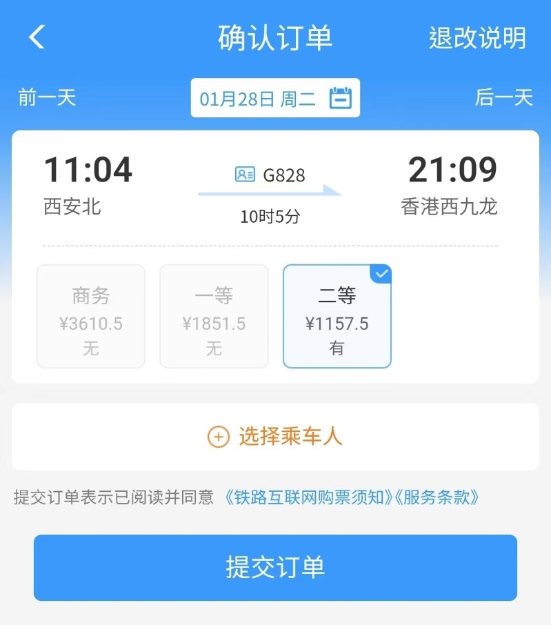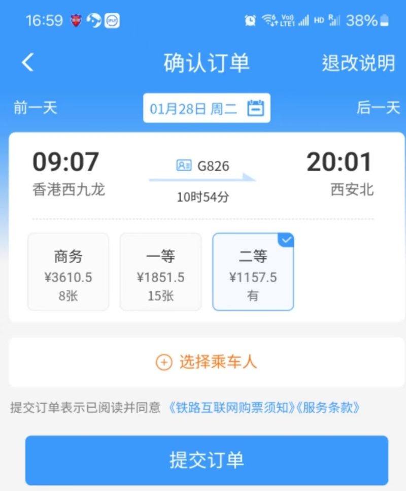 香港往返西安高鐵車次。(資料12306官網 APP)