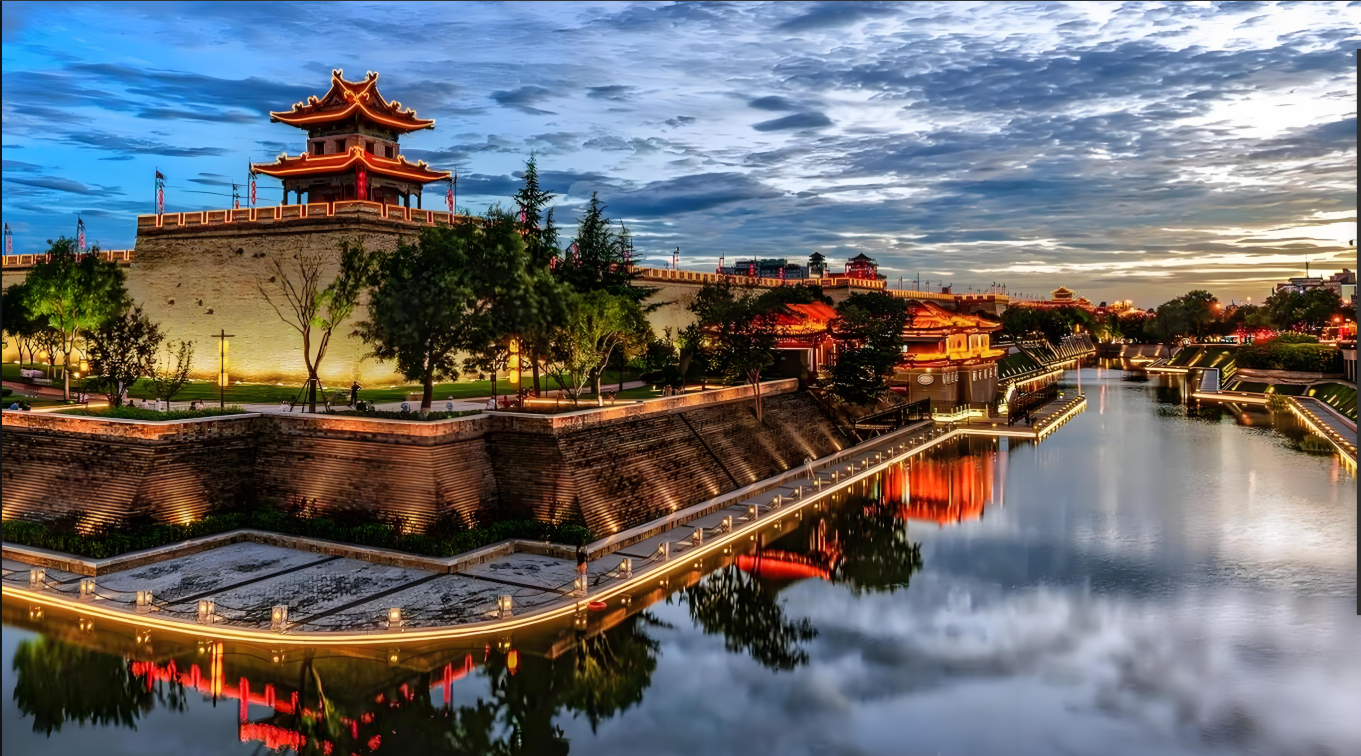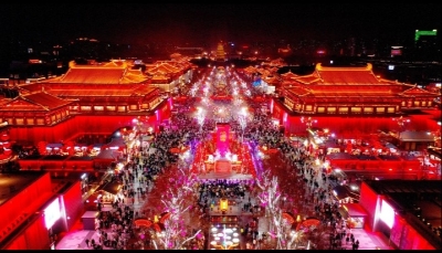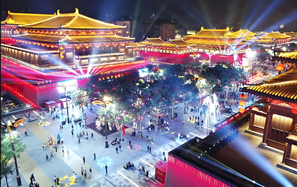 大唐不夜城是以唐朝文化為背景、建築風格仿照唐朝的建築,夜晚燈光璀璨,仿佛穿越回唐朝盛世。