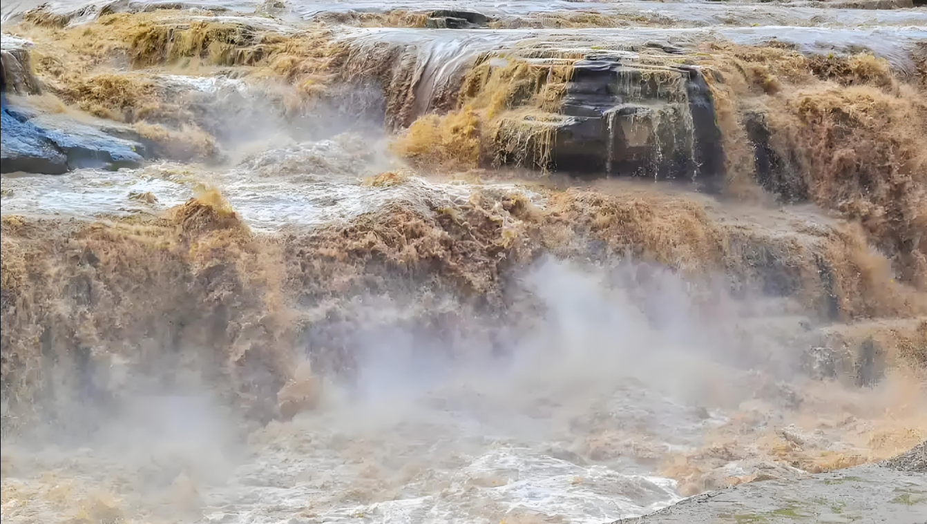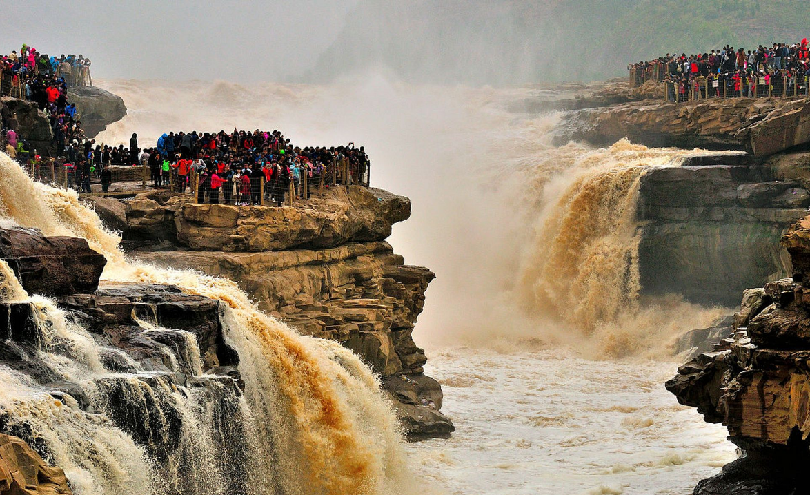 壺口瀑布是中國第二大瀑布,世界上最大的黃色瀑布。黃河奔流至此,兩岸石壁峭立,河口收束狹如壺口,故名壺口瀑布。瀑布上游黃河水面寬300米,在不到500米長距離內,被壓縮到20—30米的寬度。1000立方米/秒的河水,從20多米高的陡崖上傾注而瀉,形成“千里黃河一壺收”的氣概。