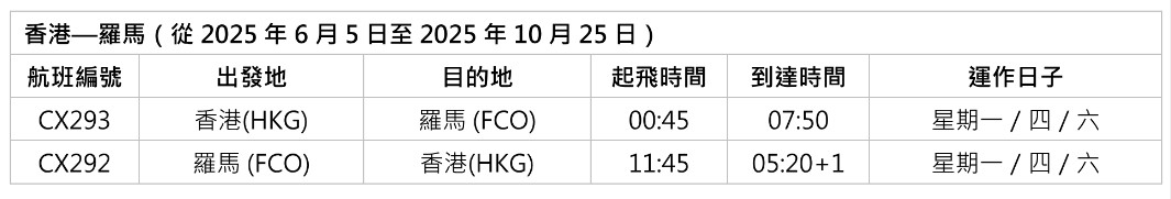 國泰航空將於6月5日重啟香港與羅馬之間的直航服務。 航班詳情此航線將由空中巴士A350-900客機營運,設有商務客艙、特選經濟客艙和舒適的經濟客艙。具體航班時間如下(均為當地時間,可能有所變動):