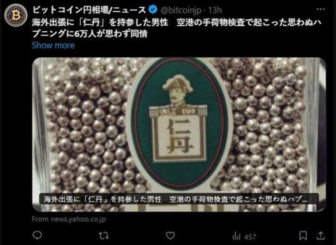 日本旅客攜“仁丹”入境迪拜卻被誤認成子彈。(圖源:X) 根據《LIMO》報導,這名網友“マッコイ”由於擔心在外國身體會不適,出國時在行李中放了日本胃藥“仁丹”,惟沒想到過安檢時,安檢人員因其外形誤認成霰彈槍子彈。由於語言不通,該網友未能立刻用英文解釋,立即遭警員包圍並關到小房間。 男子被關在“小黑屋”裡長達3小時,機場人員不斷追問他“為什麼藥品是銀色球狀?”、“為什麼包裝上印有穿軍服的人?”,他試圖解釋這是胃藥,但機場人員並不相信。最終他的上司在當地人士的協助下與機場人員溝通,才讓男子順利脫困。 該網友分享這次經歷後引起熱議,就連仁丹官方帳號也出面留言建議,仁丹使用純銀製作,旅客攜帶此藥時應特別注意安檢程序,最好跟手機、手提電腦等一起拿出來檢查。(完) 【編輯:黃璇】