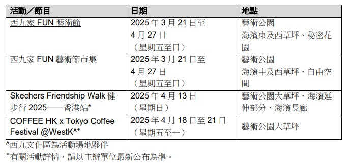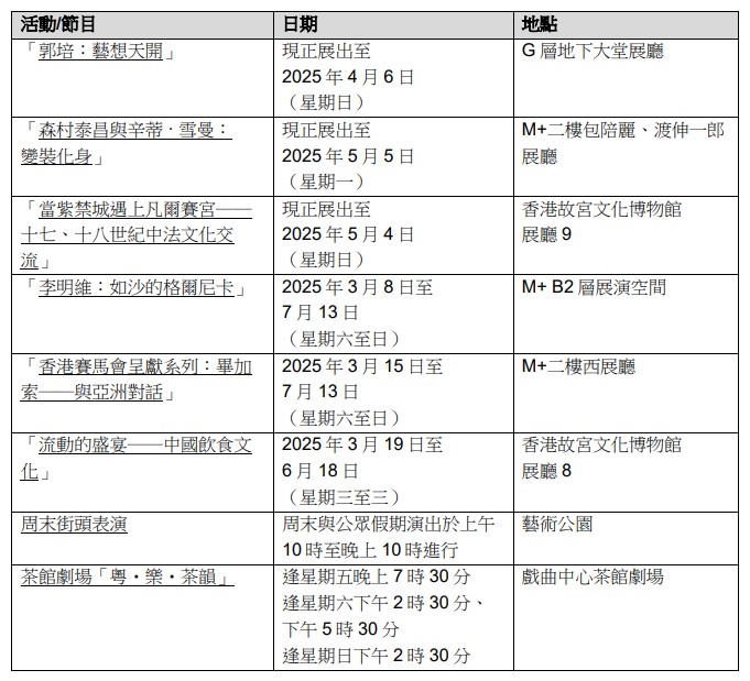 西九文化區將於即日起至4月30日舉辦“西九藝術三月慶”。 此外,第二屆“西九家FUN藝術節”將於3月21日至4月27日舉行,呈現近百個免費及售票藝術節目,包括美國藝術家組合Alex Schweder和Ward Shelley的大型戶外裝置《輪居》,以及快閃表演和工作坊。藝術節還設有“西九家FUN藝術節市集”,於五個週末提供主題飲食攤檔,促進社區參與。 M+博物館將於3月15日起舉辦“香港賽馬會呈獻系列:畢加索——與亞洲對話”展覽,展出60多件畢加索作品及130件亞洲藝術家作品,是香港歷來最大型的畢加索展覽。同期還展出李明維的大型裝置“如沙的格爾尼卡”,以沙粒重現畢加索經典之作《格爾尼卡》。 香港故宮文化博物館則推出“流動的盛宴——中國飲食文化”展覽,展期為3月19日至6月18日,精選逾110件文物,展示中國五千年飲食文化。 此外,“Skechers Friendship Walk健步行2025——香港站”將於4月13日在藝術公園舉行,包括家庭和寵物健步行活動,部分收益將捐贈本地慈善機構,並設有嘉年華活動,豐富週末體驗。