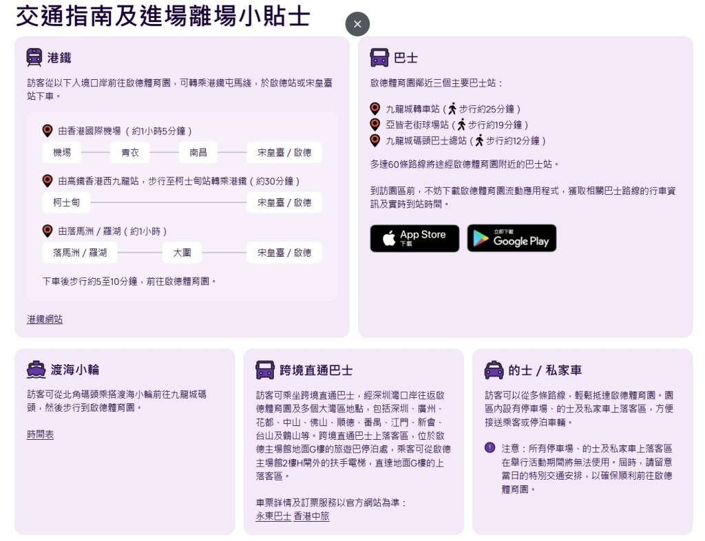 •  啟德體藝館停車場:3月28日上午7時至30日晚上10時暫停開放,主場館停車場僅供指定用途。鼓勵公眾使用公共交通工具前往,如從港鐵宋皇臺站及啟德站D出口步行入主場館。