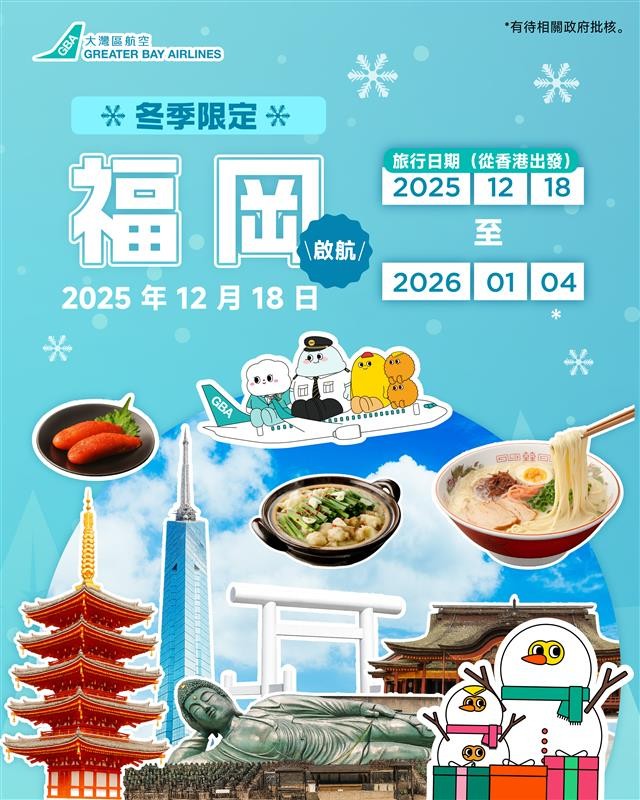 大灣區航空聖誕新年增開香港至福岡航班 每日1班