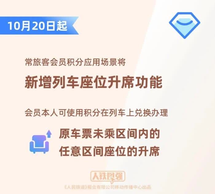 今日起會員積分新增列車座位升席功能 目前,常旅客會員積分可為本人或指定受讓人兌換火車票,兌換火車票時100積分可抵1元使用,兌換的車票可辦理1次改簽并扣減部分積分作為改簽費,不辦理退票、變更到站業務。 今日(20日)起,常旅客會員積分應用場景將新增列車座位升席功能,會員本人可使用積分在列車上兌換辦理原車票未乘區間內的任意區間座位的升席。 乘車途中,會員可掃描座椅扶手上的“鐵路暢行”二維碼登記升席需求,也可直接聯繫列車工作人員辦理。 使用會員積分升席後的新車票不能辦理退票、改簽業務,因不可抗力或鐵路責任造成升席車票不能使用時,可辦理退票,升席車票未乘區間的積分將返回會員賬戶。