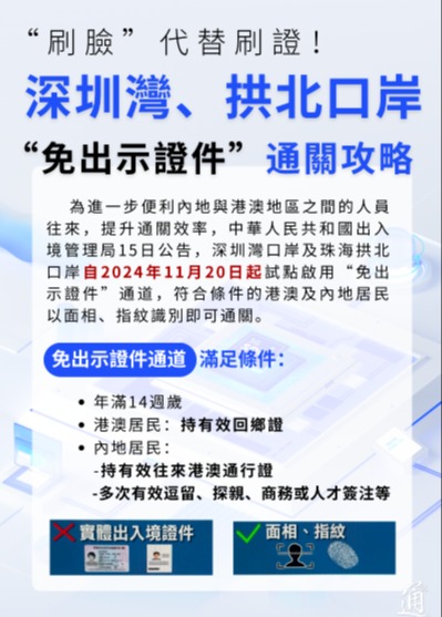 根據國家移民管理局公佈,年滿14歲以上,持有效往來港澳通行證及多次有效逗留、探親、商務、人才、其他類赴港澳簽注的內地居民,以及持有效港澳居民來往內地通行證(含非中國籍)的港澳居民,同意採集核驗臉相、指紋等信息用於邊防檢查,可選擇使用“免出示證件”通道通行。適用口岸包括深圳皇崗、羅湖、蓮塘、福田、文錦渡,珠海橫琴、港珠澳大橋,上海虹橋機場,廈門高崎機場等。