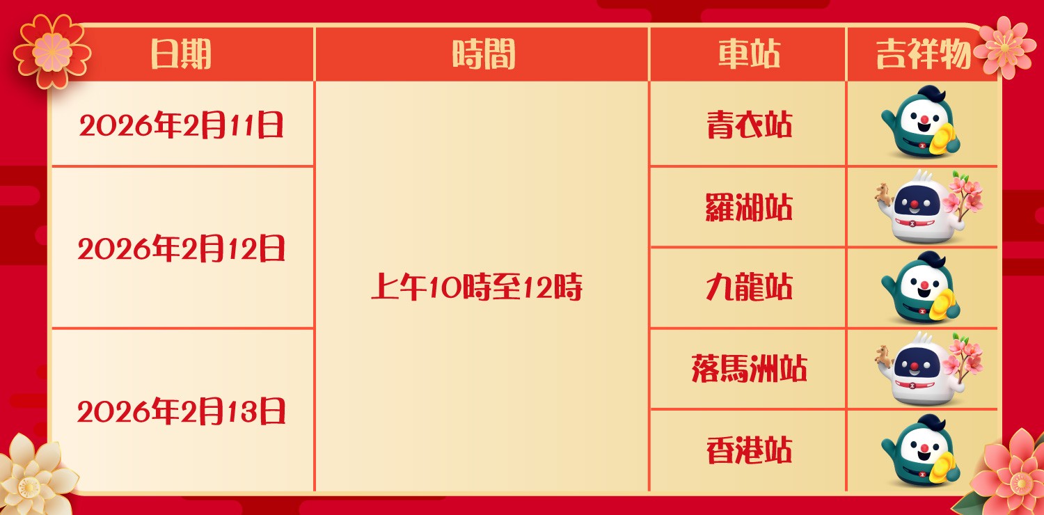 於2月11日至19日期間,三大吉祥物“鐵仔”、“機鐵仔”及“高鐵隊長”將於10個指定車站驚喜現身,與大家近距離互動合照,並大派港鐵新春大利是,包括機場快綫車票折扣券、MTR e-store折扣券、車站商店購物優惠券及港鐵商場優惠券等。大利是款式隨機,數量有限,派完即止。(完) 【編輯:黃璇】