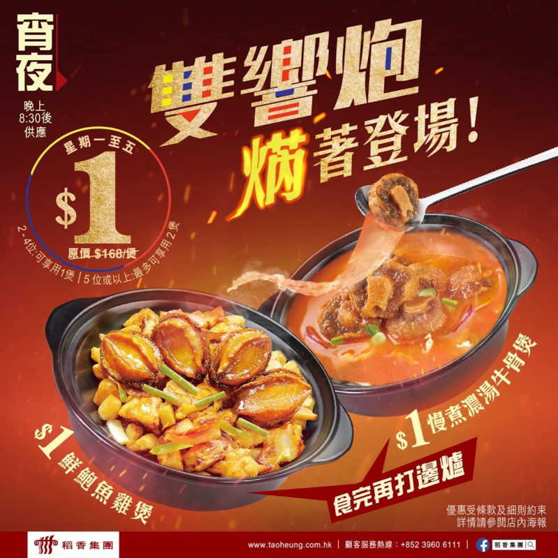 $88京城片皮鴨優惠(圖:稻香) $1鮮鮑魚雞煲及$1慢煮濃湯牛骨煲(只限堂食) 鮮鮑魚雞煲醬汁濃郁,更附有4個鮑魚,雞肉亦嫩滑,而慢煮濃湯牛骨煲亦火候十足,牛香四溢。二人同行即可以$1優惠價購買以上其一煲,入座以茗茶計算。2位至4位即可享用優惠1次,5位或以上則可享用優惠2次。每份優惠雞煲或牛骨煲,均可以半價加購火鍋配料、指定酒水及免費醬料。 時間:逢星期一至五晚上8時半後 推廣地點:全港共30間稻香、稻香茶居、稻坊、稻香漁港市集和稻香超級漁港分店堂食