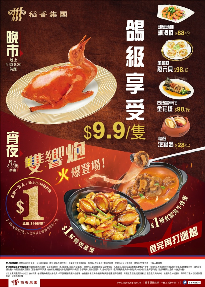 $1鮮鮑魚雞煲及$1慢煮濃湯牛骨煲(圖:稻香) $9.9乳鴿(只限堂食) 2人同行起即可以優惠價$9.9購買乳鴿1隻。(星期六、日及公眾假期收費為每隻乳鴿$38。) 時間:逢星期一至星期五下午5時30分至8時30分 推廣地點:全港共30間稻香、稻香茶居、稻坊、稻香漁港市集和稻香超級漁港分店堂食