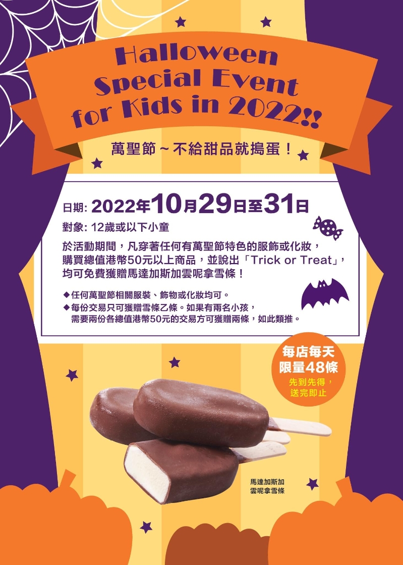 日式餅店Châteraisé今年專為小朋友推出萬聖節派雪條活動,由2022年10月29日至10月31日,12歲或以下小童凡穿著任何有萬聖節特色的服飾或化妝親臨分店,購買總值$50以上商品,並説出“Trick or Treat”,即可免費獲贈馬達加斯加雲呢拿雪條1條。