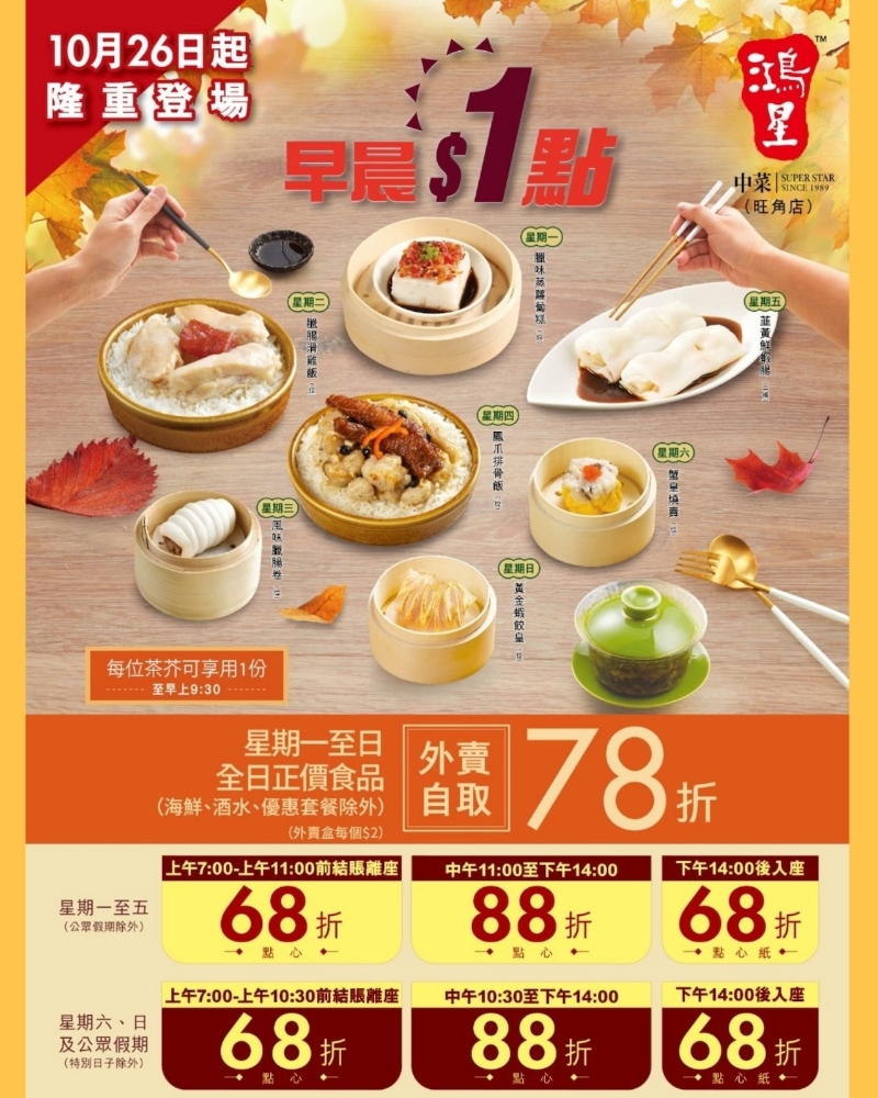 香港新聞網11月4日電 連鎖中式茶樓“鴻星中菜”近期於指定分店再推出$1早茶點心1優惠,由即日起逢星期一至日,每日都有不同早茶點心,只需$1就可以享用,有鳳爪排骨飯、蝦餃王、鮮蝦腸等,不同時段更再設茶市折扣,低至68折,相當抵食!