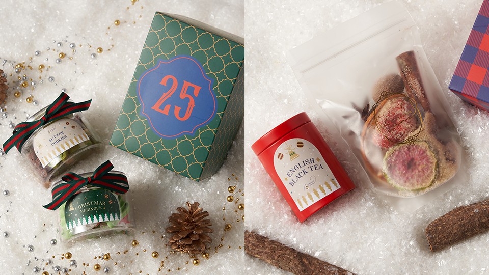 蛋白脆餅及朱古力、抹茶、蝶豆花曲奇(左)、聖誕香料茶(右)。 特色禮盒$48起 倒數月曆之外,這間甜品店還有其他應節禮盒選擇,例如聖誕瑪德蓮禮盒、聖誕冬甩禮盒、朱古力球禮盒和聖誕香料套裝,早鳥優惠價最平只需$48起,豐儉由人。