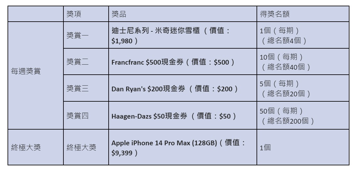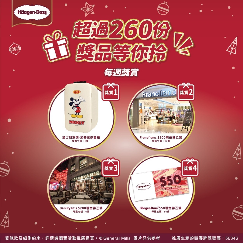 只要於推廣期間於各大便利店、超級市場、Häagen-Dazs™專門店或e-shop購買迪士尼系列派對冰袋套裝、迪士尼雪糕火鍋、迪士尼系列人物造型雪糕杯、迪士尼系列雪糕蛋糕、或雪糕火鍋(以單一發票計算),WhatsApp發送清晰收據相片或eshop訂單截圖、收據或訂單編號、姓名、身份證號碼首4個數字至+852 5105 8703,即可參加每周獎賞之抽獎,有機會贏取豐富獎品。詳情可瀏覽活動網址:https://www.haagendazs.hk/winter-promo-2022/