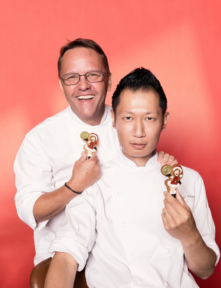 文華東方行政總廚Robin Zavou(左)與甜點主廚Paul Chan創作Mrs. Clans曲奇 參與今次義賣活動的名廚都大有來頭,包括香港文華東方酒店行政總廚Robin Zavou及甜點主廚Paul Chan;香格里拉大酒店行政總廚Uwe Opocensky及行政甜品大廚Julien Gourmelon;奕居Salisterra行政總廚Cary Docherty;Cookie DPT創辦人Wil Fang;L'Atelier de Joël Robuchon甜點主廚Cesar Augustyniak;“大師姐”創辦人麥麗敏;前香港瑰麗酒店行政糕餅總廚、Essentia by Holger Deh創辦人Holger Deh,以及柏寧酒店行政總廚Florian Muller與甜點主廚Roy Lau等等……是次活動的收益將捐贈希望之箱和職業訓練局的“展亮技能 發展中心”。
