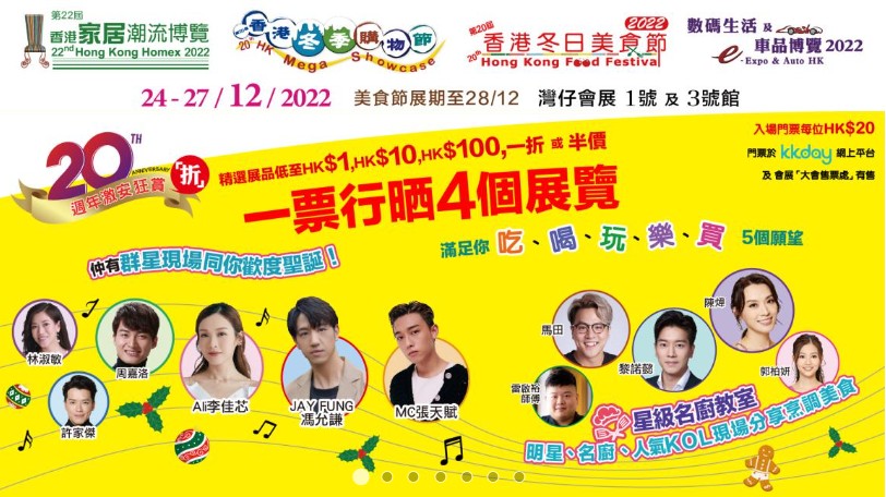 主辦方今年還邀請了一眾歌手及影視藝人到場,與入場人士一同歡度聖誕,包括馮允謙、張天賦、李佳芯、周嘉洛、許家傑及林淑敏;亦安排了一系列場內特備項目,包括“夢‘賞’成真大抽獎”、“行哂全場有著數”、消費大抽獎、專題講座及表演等,為入場人士送上豐富的節目及禮物,是聖誕假期一站式吃、喝、玩、樂的好去處。