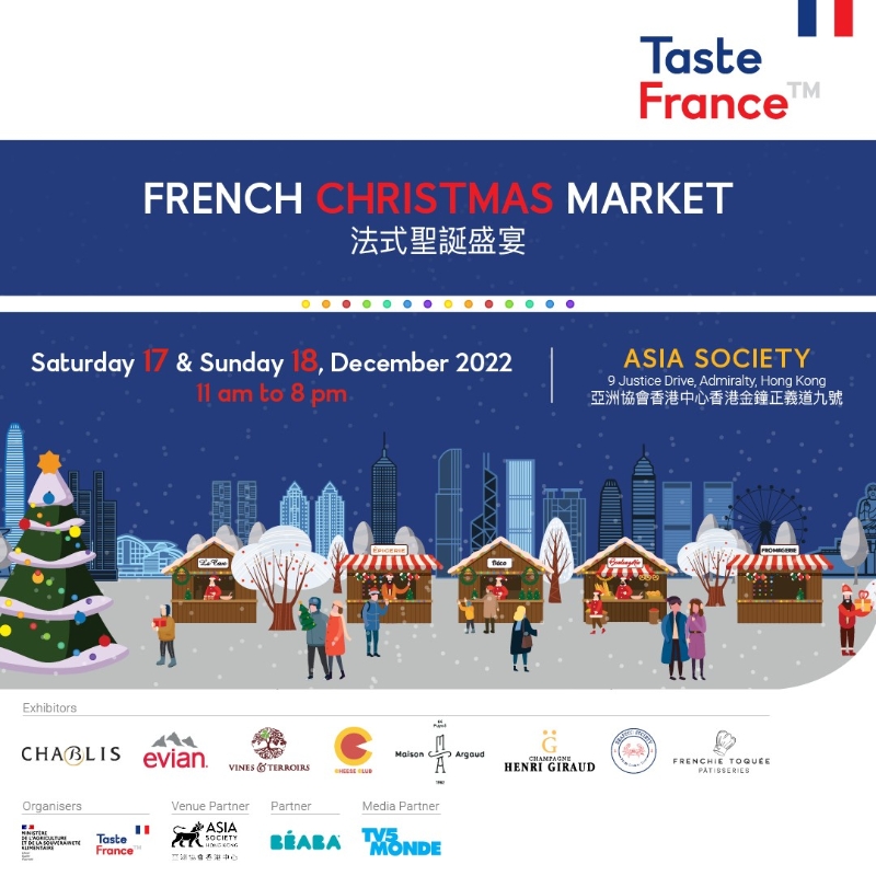 參展單位包括: 沙比利葡萄酒Chablis Wines、香檳品牌Champagne Henri Giraud、芝士供應商Cheese Club HK、依雲水Evian、法式糕點工作坊Frenchie Toquée、法國傳統美食Maison Argaud、海鮮產品供應商Seafood Society、葡萄酒供應商Vines & Terroirs、嬰兒護理產品品牌Béaba、法國電視國際五台TV5MONDE。 Taste France 味遊法國是由法國農業及食品部於2020年推出的品牌,旨在將法式生活推廣至世界各地。品牌致力透過不同活動和平台,讓更多人體驗到法國的食品和飲品,並呈現法式烹飪的珍貴文化資產,包括農業、農業產品和美食方面的豐富專業知識;優質的健康、安全和環境標準,以及公司的創新人才。 法式聖誕盛宴@亞洲協會香港中心 日期:12月17及18日(星期六及日) 時間:上午11時至晚上8時 地點: 亞洲協會香港中心(香港金鐘正義道9號) 免費登記入場,請按此登記 【編輯:黃璇】