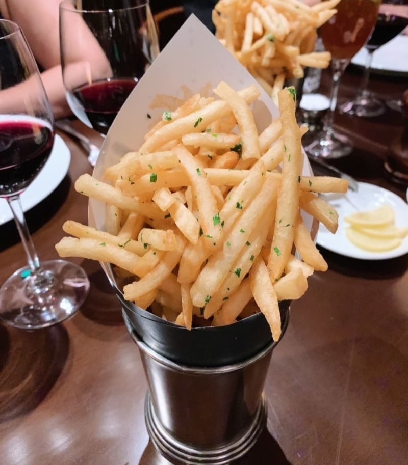 香蒜脆炸薯條,用鴨油炸成 Tango Argentinian Steakhouse 地址:西九龍ELEMENTS圓方演薈廣場頂層 / 中環雲咸街77號嘉兆商業大廈1樓 電話:2780 1181(西九龍)/ 2525 5808(中環) 餐廳本身是酒吧,裝潢風格懷舊復古,讓人感覺放鬆,適合悠閒用餐。炭燒風味的牛扒,T骨扒及肉眼扒,肉味香濃,多汁,分量夠大,有多種醬汁供選擇。香腸拼盤可一次過嘗幾款阿根廷肉腸。新餐牌的海鮮、意粉及甜點,配以充滿布宜諾斯艾利斯風格的經典雞尾酒及葡萄酒,都值得一試。
