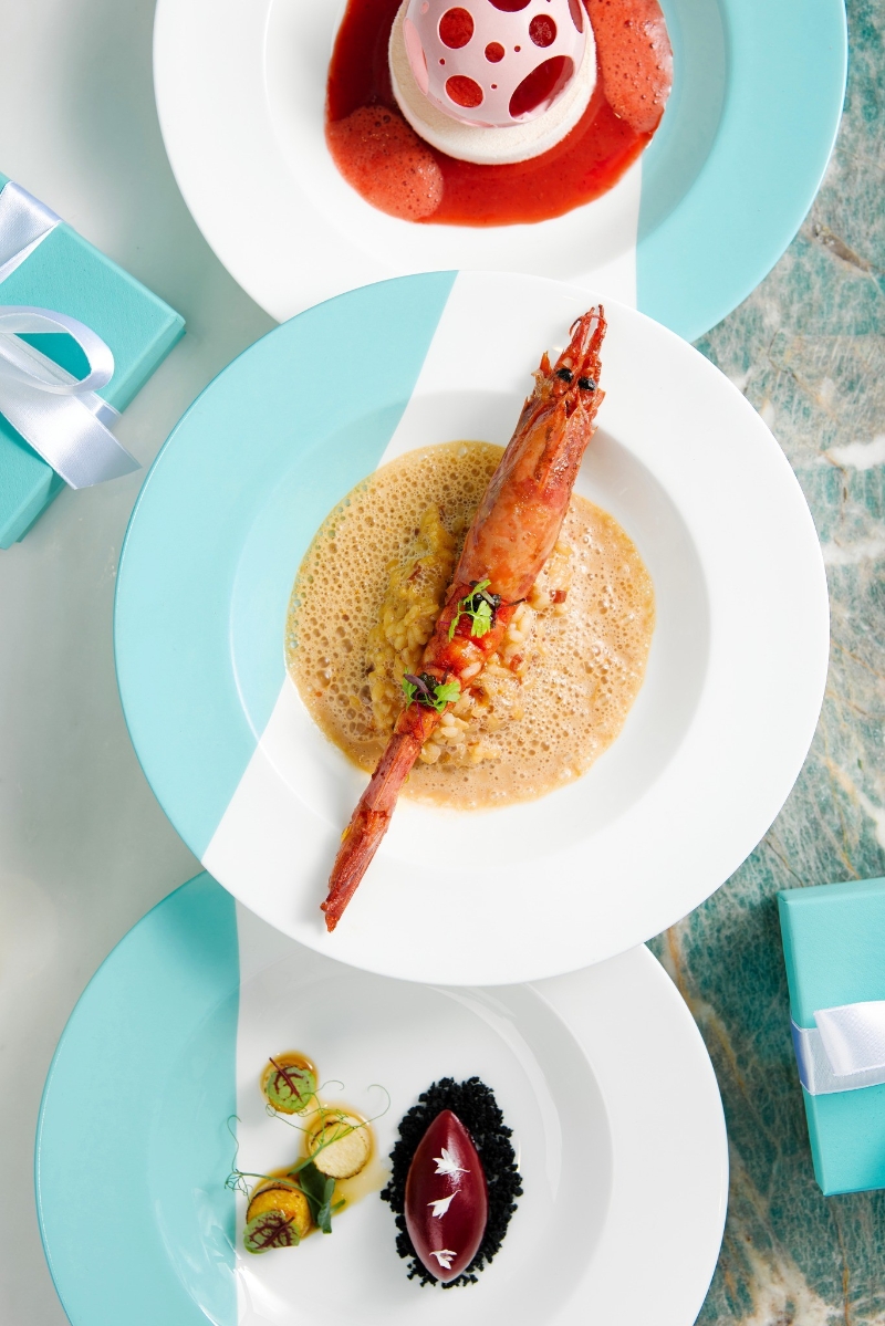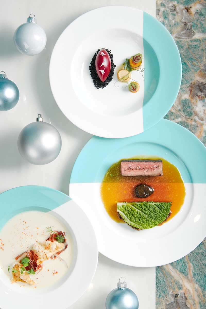 節日下午茶(圖片:品牌提供) 率先推介是頂層的甜點,深受歡迎的Tiffany迷你Blue Box精緻小巧,內層是70%黑朱古力慕絲蛋糕,夾着榛子脆脆及覆盆子醬,濃郁芬芳;紐約芝士蛋糕配上覆盆子醬,酸甜得宜;柑橘榛子撻化身為聖誕裝飾球,造型可愛別緻,內藏柑橘慕絲、榛子醬及榛子脆脆,多重口感帶來無限驚喜;士多啤梨開心果達克瓦茲嚴選日本新鮮士多啤梨,內層配上香濃軟滑的開心果忌廉,精緻可口。 鹹點方面亦不遜色,松葉蟹盒子選用日本松葉蟹,加上洋甘菊啫喱和青蘋果份外清新;魚子醬龍蝦撻盛載滿滿的波士頓龍蝦,頂層配上魚子醬,海鮮的鮮甜餘韻齒頰留香;鵝肝慕絲酥皮包裹著鵝肝慕絲,並以季節水果和熱情果啫喱作點綴,保留鵝肝細膩柔滑的口感還帶出鮮果的清新,口感非常豐富。 層架的底層為自家製作的包點,香蒜鹽之花鬆餅香氣濃郁,有別於一般的傳統鬆餅,別具一番風味;當然少不了法式杏仁蛋糕,蛋糕質地綿密濕潤、充滿杏仁的香氣,滿足你的味蕾。 三道菜午餐及五道菜晚餐 此外,主廚聯同其團隊為The Tiffany Blue Box Café顧客準備一系列別出心裁的三道菜午餐(包括前菜、湯及主菜)及五道菜晚餐(包括前菜、湯、兩道主菜及甜品)。