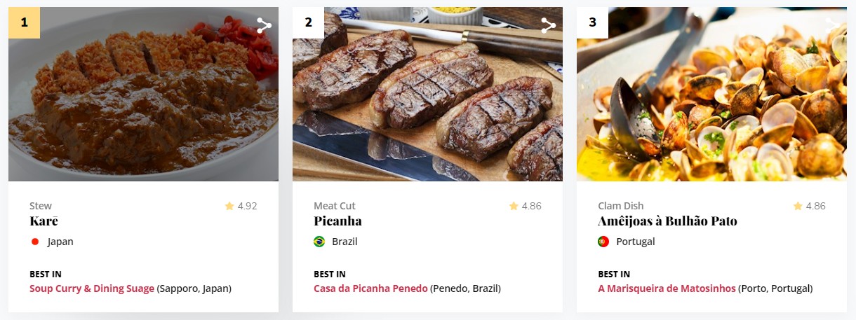 2022年美食排行第一至三名 成功佔據榜首的竟然是日本的日式咖喱,根據旅遊指南介紹,這是到當地旅遊必食的菜餚,咖喱配米飯這個組合絕對是天生一對!而第二名則是來自巴西的Picanha牛肉,在當地非常受歡迎,Picanha是巴西人眼中牛最美味及最珍貴的部位,亦是街知巷聞的巴西燒肉,經過烤爐烹煮過後肉汁十分豐富,隔著熒幕已垂涎欲滴。而位居第三名則是葡萄牙菜,名為Amêijoas à Bulhão Pato,結合了蛤蜊、大蒜、檸檬汁及白葡萄酒等,非常開胃。緊隨其次的是灌湯包、鍋貼及Phanaeng咖喱等,全部都值得一試,快快加入旅遊美食清單!