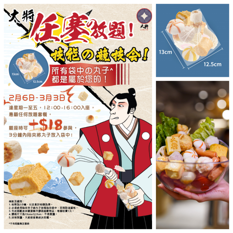 香港新聞網2月2日電 日式火鍋放題餐廳“大將”又有新搞作,繼去年舉辦“大胃王”及“高糕Go!”活動後,今次推出HK$18限時任塞火鍋丸優惠。打邊爐鍾意食丸的朋友記得留意玩法,研究好攻略去挑戰喇!