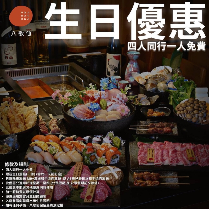 八歌仙生日優惠,4人同行1人免費 地址:旺角登打士街56號家樂坊8樓802號舖 電話:+852 2328 7303 7)阿翁火鍋館:5人同行1人免費 + 無限時任食火鍋 這間連鎖中菜館晚市推任飲任食海鮮火鍋,只要於生日月內惠顧晚市任食火鍋,5位同行,壽星即可免費食。而3至4位同行,壽星亦有半價。(註:需提前訂座及說明使用生日優惠;使用優惠時需出示身份證明文件。)