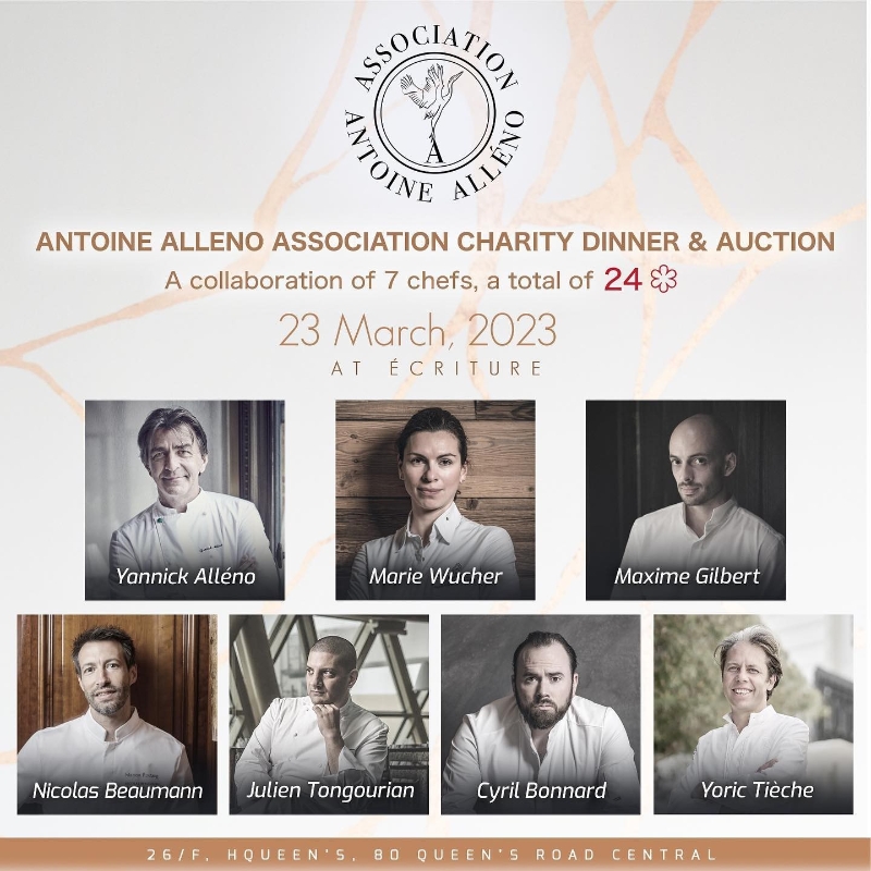 Écriture將舉辦廚師合作慈善晚宴 慈善晚宴籌集善款 遏止年輕人暴力行為 是次於米芝蓮二星法國餐廳Écriture舉辦廚師合作慈善晚宴,為Antoine Alléno Association籌集資金。籌得善款遏止針對年輕人的暴力行為的願望,並為受害者及家人提供支援。活動將由中環雲咸街OTI Gallery舉辦的餐前雞尾酒會開始展開,賓客可以一邊品嘗由Dom Perignon及Hennessy Paradis調配而成的雞尾酒,一邊率先預覽來自Louis Vuitton、Hublot、Dior、Dom Perignon等高級品牌的拍賣品。 雲集24顆米芝蓮星 此次合作的廚師,分別來自合共擁有24顆米芝蓮星的法國餐廳,他們將為活動炮製美食。當中包括:Yoric Tieche(法國Cap-Farrat四季酒店米芝蓮一星餐廳Le Cap行政總廚)、Cyril Bonnard(Le Parc Hotel Obernai行政總廚)、Julien Tongourian(米芝蓮三星Robuchon Au Dôme Macao行政總廚)、Marie Wucher(Le Parc Hotel Obernai糕餅主廚)、Nicolas Beaumann(米芝蓮二星Maison Rostang行政總廚),以及享譽全球的Yannick Alléno(米芝蓮三星Pavillon Ledoyen、米芝蓮二星L'Abysse及米芝蓮三星Le 1947行政總廚)。 Antoine Alléno Association慈善晚宴及拍賣會 時間:3月23日(星期四) 地點:Écriture(香港中環皇后大道中80號H Queen's 26樓) 訂座詳情:按此瀏覽 【編輯:黃璇】