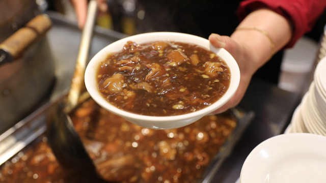 老北京叫“喝炒肝”而非“吃炒肝” 由豬大腸、豬肝等製作而成的北京炒肝,說是“炒”其實是一碗勾芡的濃稠羹湯。因為一攪和芡就澥了,所以老北京喜歡拿起碗微微旋轉“喝”炒肝,而非“吃”炒肝。炒肝作為北京傳統早點的重要組成部分,已有百餘年歷史,最早是由開業於清同治元年(公元1862年)的“會仙居”發明的。它是在原來售賣的“白湯(豬)雜碎”基礎上,去掉豬心和豬肺並勾了芡,從而形成炒肝。1930年,另外一家炒肝老店天興居在會仙居對面開業,其採用味精、醬油等當時的新式調料,生意逐漸蓋過了會仙居,直至1956年兩店合併,就只剩天興居的招牌了。姚記炒肝店、天興居、緣趙記的炒肝都值得一試。 6、老北京炸醬麵