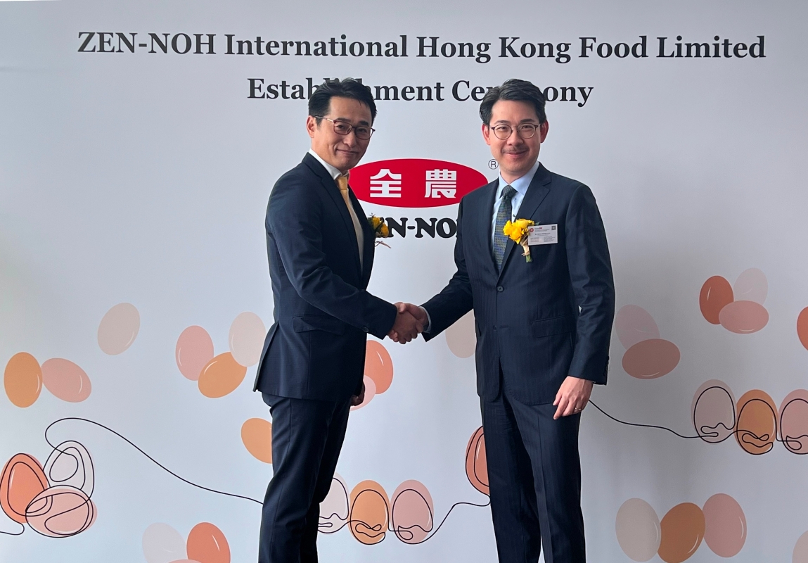 投資推廣署助理署長蔣學禮(右)和全農國際香港食品有限公司董事總經理金築道弘於開幕禮上合照 他補充:“我們著重為本地市場提供高質素的產品,會聆聽香港客戶的意見,與他們商討解決方案並提出建議。我們藉着在香港開設的新食品工場,生產不同種類的蛋製品,以滿足不同客戶的需求。我們亦會研究將蛋製品出口至深圳和廣州。” 投資推廣署助理署長蔣學禮表示:“我們很高興看到全農國際致力為香港客戶提供高品質的日本蛋製品。香港的日本餐飲業發展蓬勃,配合香港自由港的地位和完善的物流運輸網絡,是全農國際拓展業務的理想據點。”