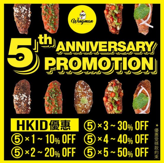 Wingman慶祝5周年推出限時優惠。 條款及細則: 優惠由即日至2023年5月31日; 優惠只限堂食、不可與其它優惠同時使用; 下單前需出示有效香港身份證方可享用此優惠; 每檯只可用一張身份證換領優惠; 下單前讚好Facebook專頁或追蹤IG; 優惠每個月只限使用1次; 另收原價加一服務費。 【編輯:黃璇】