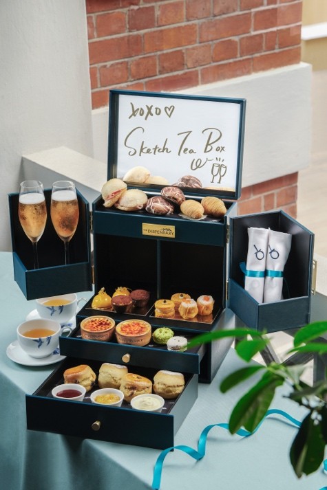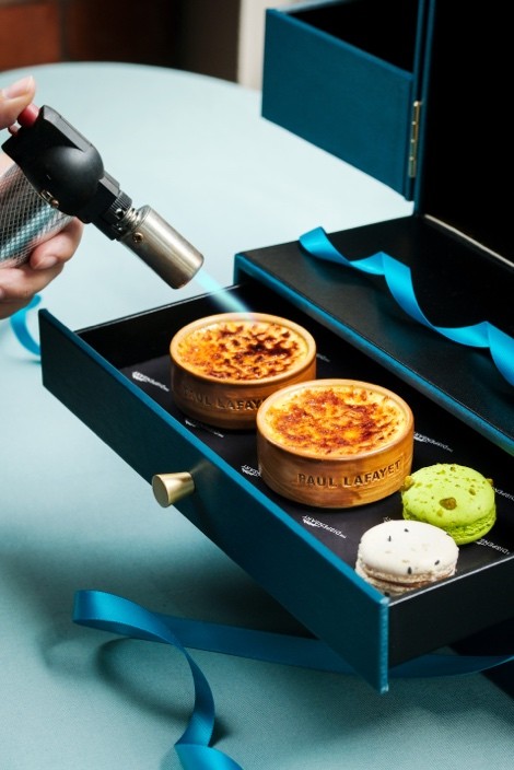 打開Sketch The Box寶盒令人眼前一亮。 甫打開Sketch Tea Box的盒子,一系列琳瑯滿目的鹹甜糕點整齊列陣,令人眼前一亮。賓客可自行在盒中鏡子畫圖寫字,設計屬於自己的茶盒。下午茶菜單呈獻由The Dispensary兩旁的餐廳Cantina和The Chinese Library炮製的精選美食,包括蟹籽燒賣、松茸包、和牛酥等中式點心,以及傳統意大利脆麵包(Gnocco Fritto)配mortadella肉腸stracchino芝士和三文魚意大利軟芝士三文治(Salmon and mascarpone sandwich)。 期間限定的Paul Lafayet招牌迷你法式焦糖燉蛋,採用馬達加斯加雲呢拿豆手工製作,口感絲滑細緻,頂層的焦糖於賓客面前即席烘燒而成。此外,賓客亦可品嚐到Paul Lafayet的特色馬卡龍,內層口感柔軟,有芝麻和開心果兩款口味,其靈感源自中國和意大利的經典食材。 除了Paul Lafayet主理的手工甜點外,下午茶還備有意大利經典提拉米蘇及清新醒胃的阿瑪菲檸檬圓頂蛋糕(Amalfi lemon dome)。正當賓客逐層探索茶盒的滋味糕點,會發現底層歷史悠久的經典提子英式鬆餅,配上英國康瓦爾凝脂奶油、自家製士多啤梨醬和香橙柚子醬食用。