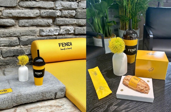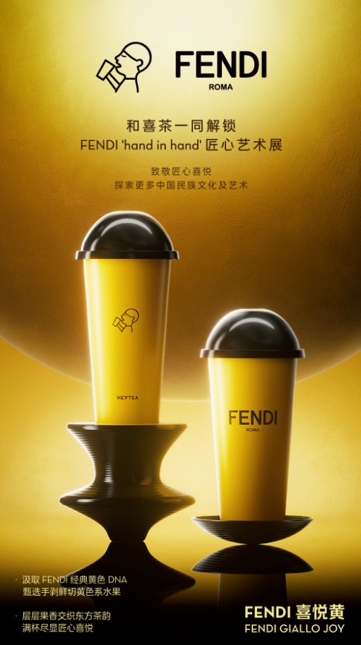 喜茶在內地門店特別呈獻“FENDI 喜悅黃”限定飲品。 喜茶曾於2022年與藤原浩主理的品牌fragment design開展聯名企劃,此次與FENDI的合作,是新茶飲品牌與老牌時裝屋的首次聯名,亦是雙方就 FENDI“hand in hand”在地文化的全新探索與嘗試,為傳統與經典賦予匠心喜悅。