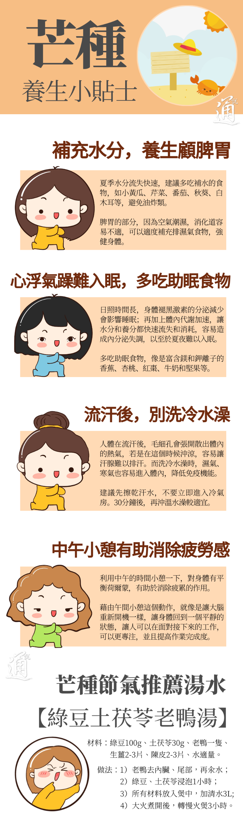 香港新聞網6月6日電 今天(6月6日)是二十四節氣裡的“芒種”。芒種通常落在每年陽曆的6月6日或7日,太陽到達黃經七十五度,就是芒種的日子。芒種是一個反映農業氣候現象的節令,也預告著天氣開始炎熱。 此時梅雨季進入尾聲,但雨天仍會繼續在我們身邊。炎熱的天氣讓熱對流上升,帶來的午後雷陣雨仍然不容小覷。環境和身體仍然充滿濕氣,保養的方法,要延續“小滿”節氣,順著日出日落“晚睡早起”(可以不用太早睡,但盡量不超過晚上11點)。下午3點前,建議小睡一下補充體力。一起來了解一下芒種養生重點吧!