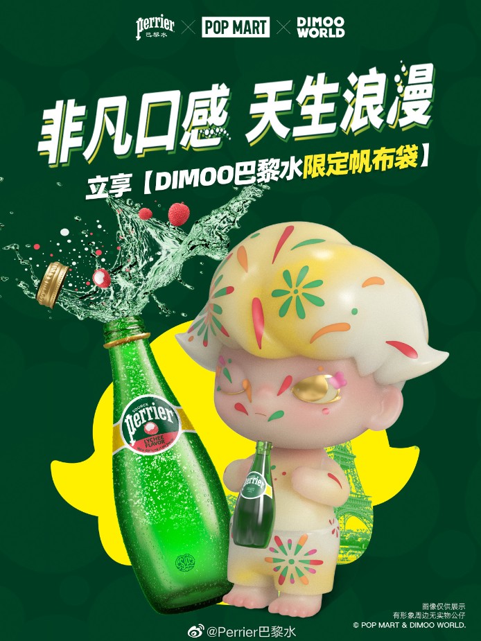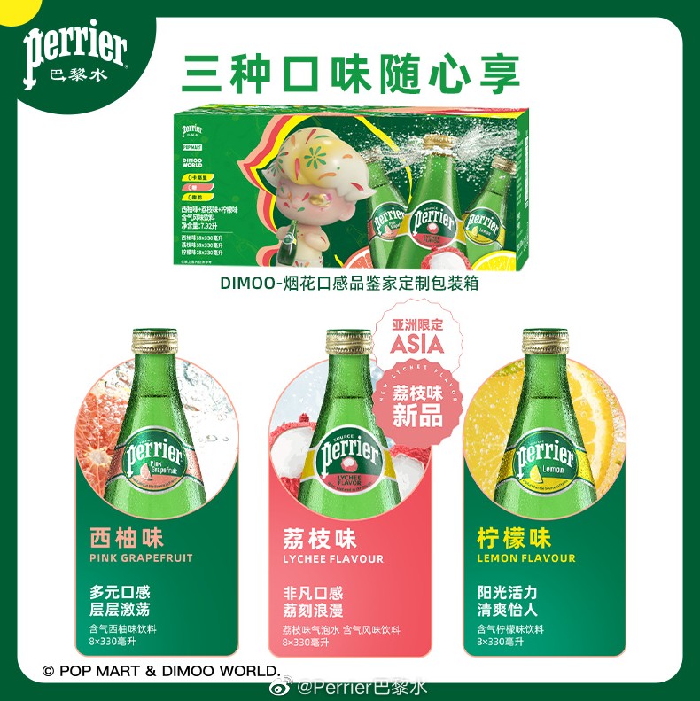 Perrier巴黎水與泡泡瑪特DIMOO聯名,帶來多款周邊產品。 巴黎水還官宣了與泡泡瑪特IP DIMOO的浪漫聯名,帶來荔枝+西柚+檸檬混合裝、手機支架、吸管杯、抱枕等聯名好禮,同時巴黎水也與DIMOO形象有深度合作,推出限量的浪漫氣泡系列,演繹天生浪漫,並在北京泡泡瑪特的快閃店打造了二者聯名形象的打卡裝置,邀請用戶一起來享受,被繽紛果味巴黎水包裹的浪漫夏天。
