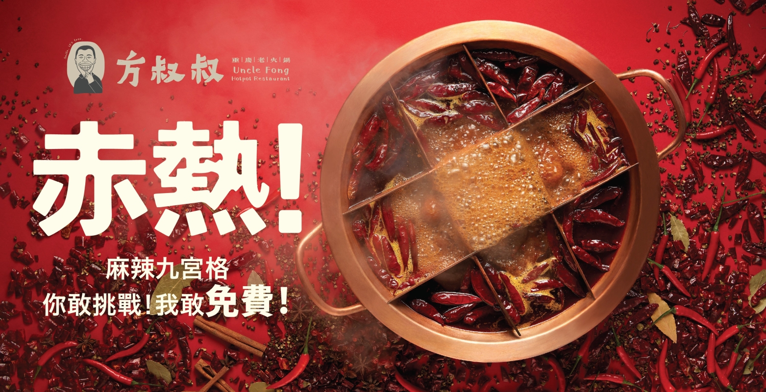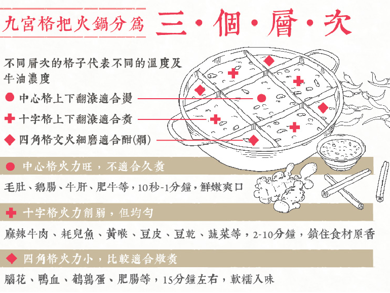 餐廳推出“九宮格麻辣挑戰”套餐,推廣期內有優惠。 重慶老火鍋最重要是麻和辣,餐廳選用重慶石柱紅頭茬辣椒、漢源花椒,再加上等牛油及郫縣豆瓣醬、雲南黃口老薑等幾十種香料,經40分鐘不斷炒料才熬製成湯底。而“九宮格麻辣大紅鍋”不同分格溫度有所不同,主要分為中心格、十字格和四角格,烹煮食材時,放進正確的分格,才可嘗到食材的鮮味。如中心格火力最旺,不宜久煮,適合毛肚、鵝腸、牛肝、肥牛等;十字格火力稍弱,但卻均勻,適合麻辣牛肉、耗兒魚、黃喉、豆皮、蔬菜等,鎖住食材原香;四角格火力小,較適合炆燉,如煮腦花、鴨血、鵪鶉蛋等,軟腍入味。