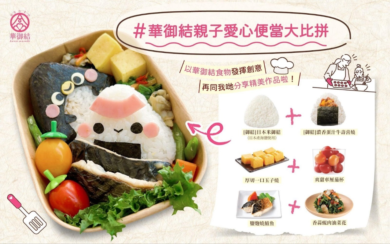 華御結由即日起至8月31日舉辦“華御結親子愛心便當大比拼”。 日系媽媽KOL示範趣致造型便當 輕鬆上手無難度 想參加“華御結親子愛心便當大比拼”,但又對食物配搭與造型毫無頭緒?華御結誠意邀請烹飪導師、食譜書作家兼日系媽媽KOL Candace Mama(古靄茵)與女兒,親自示範以御結製作可愛便當。作為身兼多職的多功能媽媽,Candace平日經常花盡心思,以顏色繽紛的食材為小朋友製作營養豐富的愛心便當,令他們愛不釋手。而華御結每月均有滋味新品登場,可以為Candace帶來便利,一次過齊集多款滋味材料,尤其是高品質又香甜可口的日本米御結,更是自家製便當的必備之選,即使是小朋友都可以輕鬆參與製作,過程充滿樂趣,同時傳遞親子之間的窩心暖意,感覺大滿足!