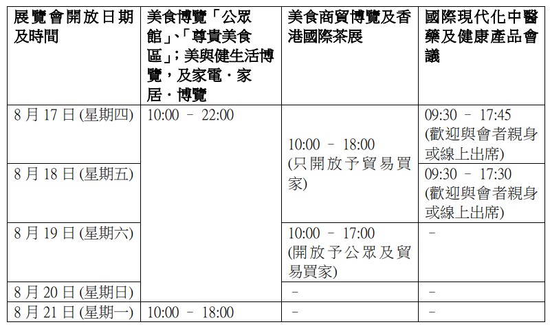 香港新聞網8月15日電 由香港貿易發展局主辦的美食博覽、美與健生活博覽,及家電‧家居‧博覽,將在本周四至下周一(8月17至21日)於香港會議展覽中心舉行。而8月17至19日期間,同場亦有升級的美食商貿博覽和再次登場的香港國際茶展,兩項貿易展首兩天均為貿易買家而設,展期的最後一天(8月19日)會同時開放予公眾人士,讓大眾盡情品嚐美食和享受購物的樂趣。而今年國際現代化中醫藥及健康產品會議(中醫藥會議),繼續會由現代化中醫藥國際協會聯同香港貿發局及八大科研機構攜手籌辦,於8月17及18日舉行,向業界提供專業中醫藥資訊並分享科研成果。