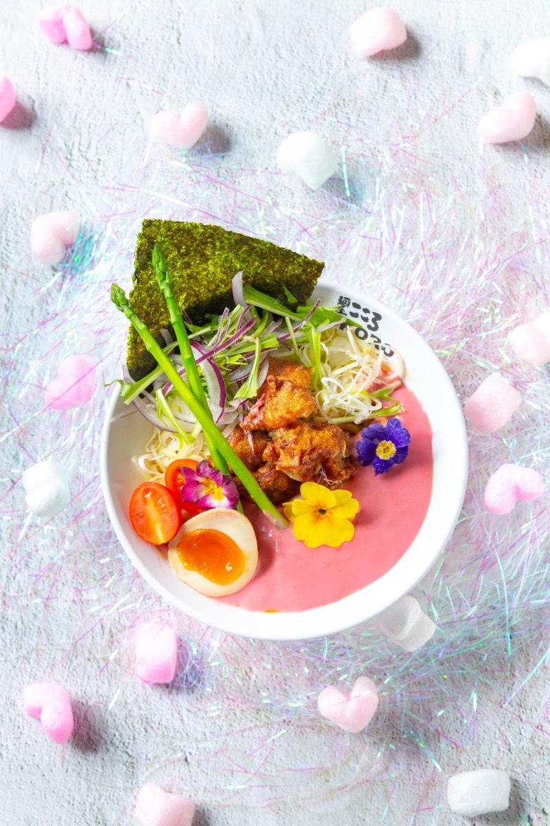 限定版撈麵“戀の味” 。 以夢幻櫻色咖哩配搭香脆唐揚炸雞的粉紅限定版“戀の味”,選用的麵條於店內新鮮手製,煙靭有麥香,粉紅咖喱採用天然方法調配,添加了紅菜頭的天然色素,將色澤染成粉紅;炸雞即叫即炸,口感微辣,外脆內嫩;配上溏心蛋、新鮮配菜及食用花,味道層次豐富。另一款限粉紅限定版“櫻花拿鐵”,淡淡花香配搭香醇日本牛奶,口感溫柔微甜,滿滿的粉紅色也為食客帶來浪漫的視覺享受。