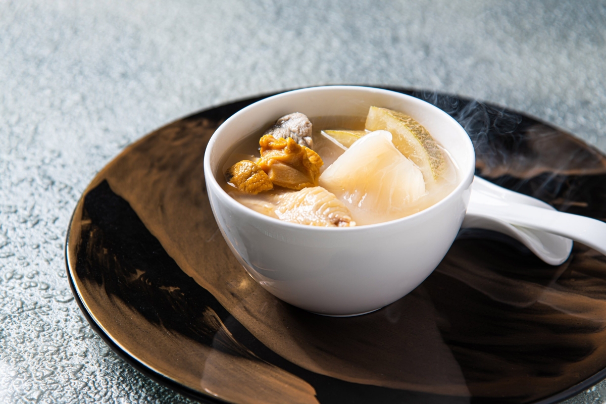 花膠螺頭蜜瓜爵士湯。 為慶祝中秋佳節,米芝蓮星級粵菜食府明閣匠心呈獻甄選四人套餐,為您與家人們締造難忘的節日回憶。中菜行政總廚李悅發以矜貴食材入饌,包括花膠、鮑魚、和牛及東星斑等,精心挑選了一系列的明閣招牌菜式,當中不能錯過花膠螺頭蜜瓜爵士湯、鮮胡椒東星斑球及遠年陳皮和牛面頰等,適合與一眾親友團聚共享豐盛佳餚,一同踏上經典粵菜尋味之旅。 The Place餅店中秋限定•玄米茶鹹蛋黃杏仁蛋糕