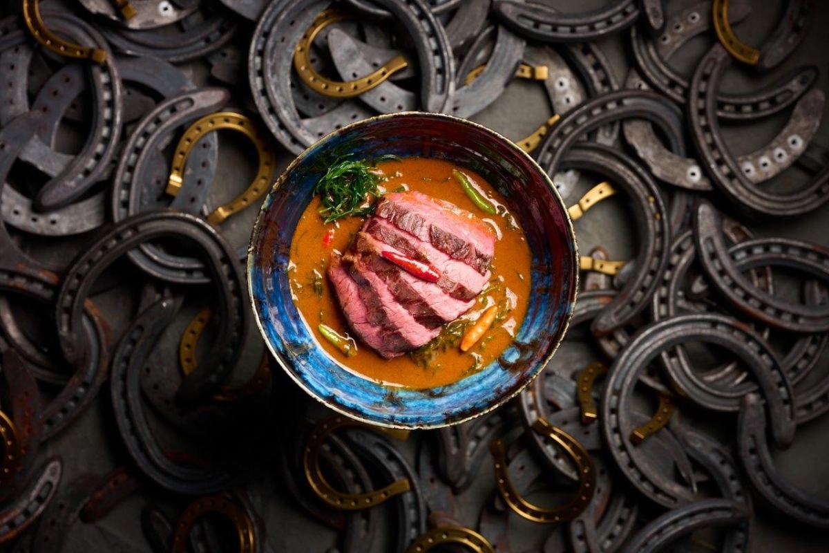 香芋椰奶流心紫薯丸。 最後,以香芋椰奶流心紫薯丸為這頓盛宴劃上甜蜜句號。這道精緻甜品將食材既濃郁又柔和的味道巧妙融合,搭配在餐桌旁用 tian op(泰國甜點蠟燭)煙薰椰奶,達至完美平衡。這種用來薰香食物的馬蹄狀的香氛蠟燭在泰國烹調中歷史悠久,主要用於製作皇室甜品。 妙·泰故事 餐廳的名稱源於倫敦昔日的馬廄(Mews)。在汽車大行其道之前,馬車是主要的交通工具,倫敦的高級宅邸旁邊常常有成排的馬廄,樓下停馬車,樓上是馬伕一家人的生活區域。妙·泰以蹄鐵匠工作間為設計靈感,細節豐富,漫步其中的賓客仿彿瞬間穿越時空。鑄鐵鍛造工具、蹄鐵和拱形磚砌天花板相映成趣,生動再現18、19世紀的英倫風情。