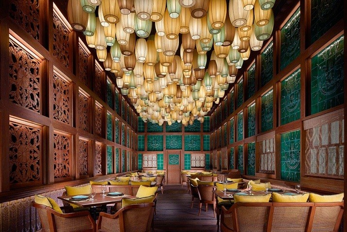 富有戲劇感的設計風格貫穿整個空間。 富有戲劇感的設計風格貫穿整個空間。正如倫敦的馬廄有通往主人房子的秘密通道,通往主用餐空間的入口亦暗藏玄機。賓客將來到一面掛滿馬鞭的牆壁前,當拉動正確的馬鞭後,一道神秘大門將緩緩打開,通往三個格調充滿泰國文化氣息的用餐空間。大象房以精美的手工雕刻泰國木板以及吊燈作裝飾,配以奢華的織物傢俱;燈籠房採用3D立體瓷磚和柔和的古風絲綢吊掛燈籠;而巨人房則設有數百件泰國巨型古董門環,以及用布藝嵌製的木製門框等裝飾。 【編輯:黃璇】