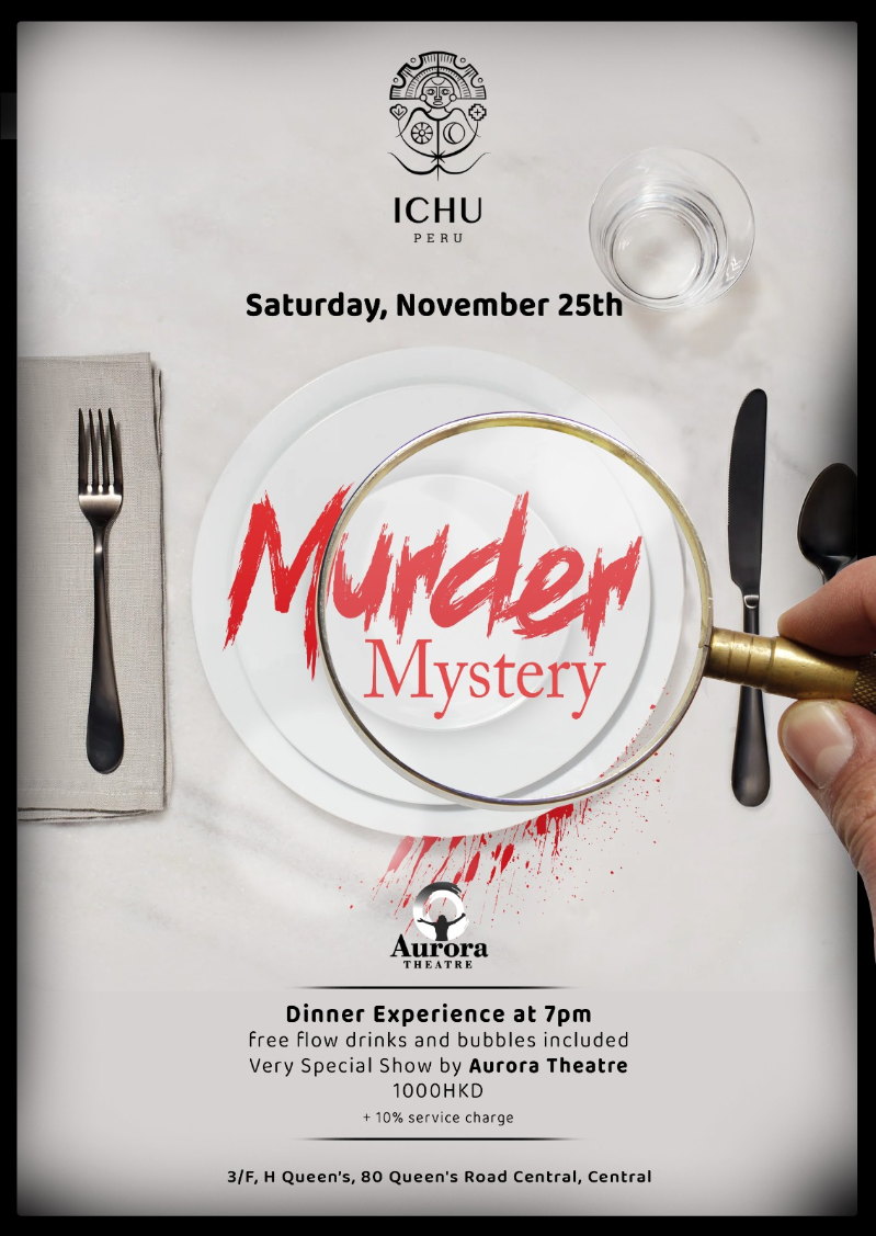 ICHU 11月25日與Aurora Theatre合作呈獻“謀殺之謎”沉浸式晚宴。 受秘魯菜豐富文化的啟發,ICHU與Aurora Theatre將會帶你進入充滿秘魯美食的神秘國度,一同度過刺激緊張的夜晚。主廚Anders精心設計三道菜以展現秘魯美食豐富多元的魅力;同時客人需要發揮他們的偵探能力和團隊精神,一同解開謎團並找出兇手,推斷整個故事。能夠解開迷團的大贏家即可有機會贏得千元餐飲券。