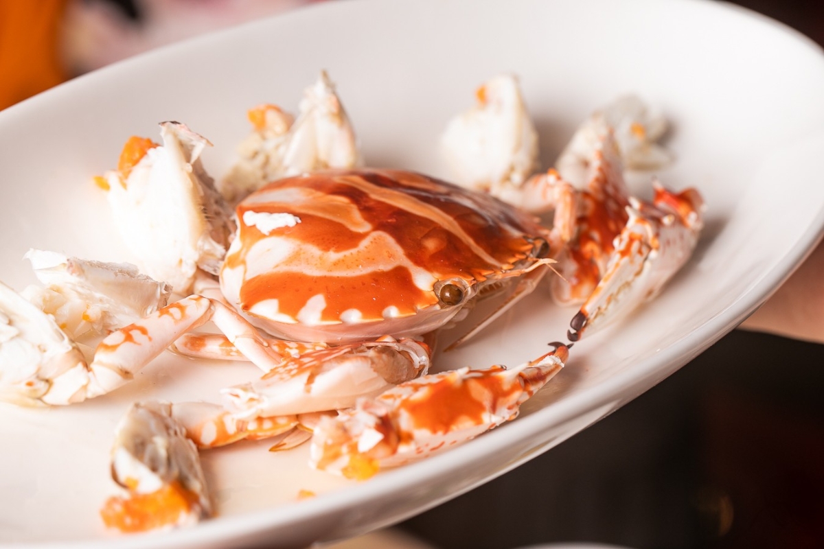 潮式凍紅蟹。 潮汕菜亦以烹調海鮮見長。餐廳的“凍紅蟹”選用廣東汕尾的特產紅蟹,肉爽鮮美,帶淡淡海水鹹香,建議蘸紅醋食用。生醃也是潮汕特色之一,“生醃大閘蟹”用高度白酒、薑茉蒜蓉、秘製醬汁等以低溫醃製大閘蟹,直至大閘蟹與醬汁配料融為一體,呈半透明狀,蟹膏橙黃豐腴,嫩滑的蟹肉散發淡淡酒香,口感如雪糕冰爽鮮甜。