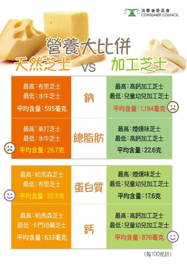 (香港新聞網製圖) 天然芝士跟加工芝士的分別 天然芝士:主要原料是未經或經巴士德消毒(pasteurisation)的牛奶、水牛奶、山羊奶或綿羊奶等,加入乳酸菌(starter culture of lactic acid bacteria)及/或產生香味的發酵細菌(non-starter culture of lactic acid bacteria)和其他無害微生物(如黴菌和酵母菌)的培養物,將奶類中的乳糖發酵成乳酸。之後再加入凝乳酶或其他凝結劑(酸性物質如醋、檸檬汁)使奶中的蛋白質凝結,並加入鹽分、飲用水和其他添加劑(如色素和防腐劑)。 加工芝士:又稱“再造芝士”,最常見就是片裝芝士。這類芝士是將1種或以上的天然芝士磨碎、溶化,再加入牛油、酪蛋白、奶粉、乳清粉、乳酸、乳糖等奶類配料,以讓產品達至理想的味道、口感和遇熱溶化度。生產商還會加入不同的色素、穩定劑、抗結塊劑、防腐劑和乳化劑,幫助芝士變成理想的形狀如片裝、棒裝等,及延長其保質期。