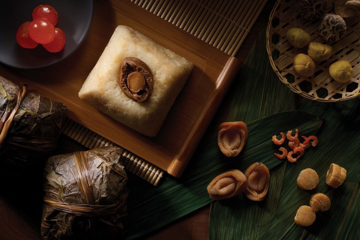 金殿乾鮑瑤柱裹蒸糭。 金殿日本紅豆鹹肉糭用料同樣一絲不苟,清甜而不膩的上等日本紅豆配搭甘香的油心鹹蛋黃、以頤和園醬油調味得宜的關刀豬腩肉及軟熟的糯米,將鹹甜滋味完美結合,每一口皆齒頰留香。為彰顯食材的天然真味,糉子並無加入鹼水製作。
