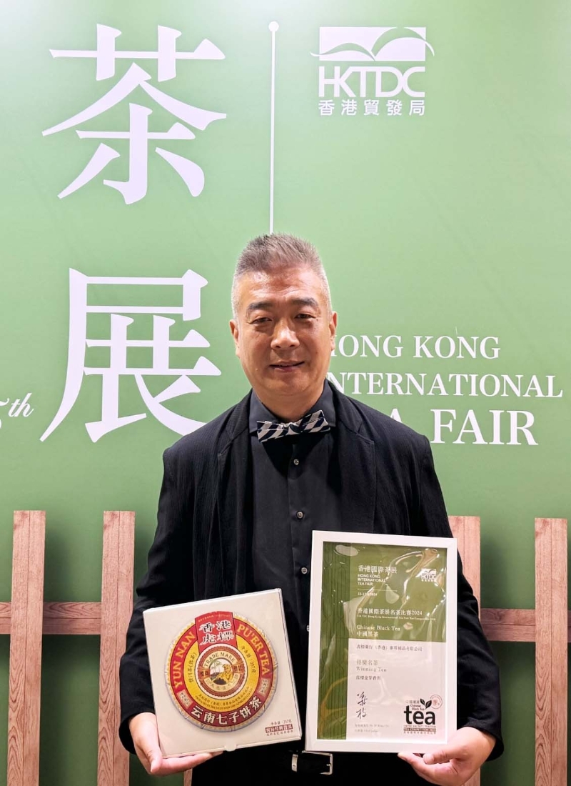 虎標公司總裁楊小宏展示繼2023年虎標精品紅茶榮獲紅茶組大獎後再獲大獎