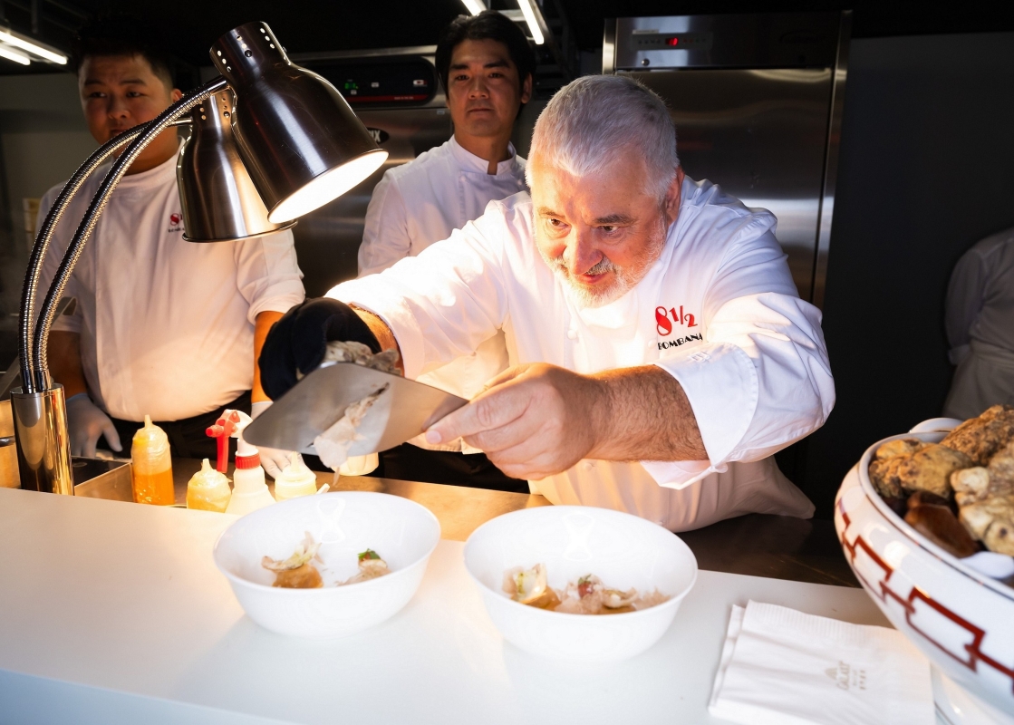 米芝蓮三星名廚Umberto Bombana與團隊創作了帕瑪森芝士鵝肝雲吞配牛清湯。(澳門銀河供圖)