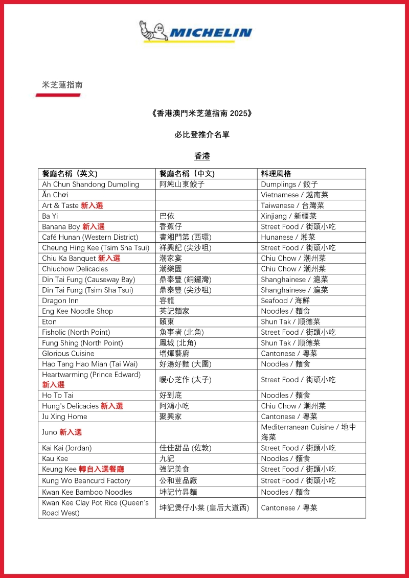 米芝蓮必比登推介的香港新上榜食肆: ● Art & Taste:除了經典牛肉麵、滷肉飯和蛋餅,還提供多款台灣小吃。外省牛肉麵湯頭香濃,麵條富彈性,建議選擇半筋半肉,前者軟腍入味,後者帶有肉香。 ● 香蕉仔:憑藉香蕉煎餅而小有名氣,提供多種口味,包括豬肉鬆配馬蘇里拉芝士。 ● 潮家宴:菜單涵蓋具代表性的潮州菜式,滷水獅頭鵝採用潮汕地區的鵝,鹹菜胡椒豬肚湯是店內招牌。 ● 暖心芝作(太子):以石磨即場將黑芝麻研磨成糊,再製作成芝麻糊、雪糕、流心布甸、黑芝麻豆漿等甜品和小吃。 ● 阿鴻小吃:菜單以傳統潮州菜為主,打冷、鹵水等一應俱全。這裏的白鹵水調味較少鹽糖,着重食材本身的味道,其中鵝片肉香濃郁,脂肪較薄。阿鴻炒飯是招牌菜之一,鵝肉、XO醬、櫻花蝦等帶來豐富口感。 ● Juno:南法風味炭烤鱸魚的火候及調味得宜,皮脆肉嫩,是這間地中海餐廳的招牌菜。自製的迷迭香意大利麵包鬆鬆軟軟,與炭烤甜椒等小吃是絕配。 ● 強記美食:臘味糯米飯遠近馳名,另煎蝦米腸粉、花生旺菜豬骨粥等小食亦值得一試。 ● Lulu Baobao:“溫柔”蔥油拌麵的手工製麵條充滿嚼勁,配上恰到好處的蔥油,香氣十足。招牌小籠包內餡飽滿多汁,同樣值得一試。 ● 泰排檔:提供地道的泰國街頭美食,包括船麵、炒河和小吃。推薦醉貓炒河,麵條帶焦香,鹹辣中透着微甜,雞蛋和打拋葉的香氣撲鼻,層次豐富。和牛船麵依照傳統在豬骨湯底加入豬紅,再以熱湯將和牛稍為燙熟。(完) 【編輯:黃璇】