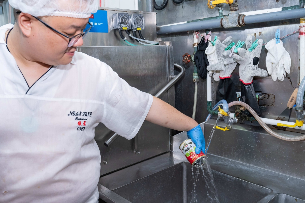 負責水吧的前線員工展示日常使用淡奶後,處理及清潔金屬罐的流程。